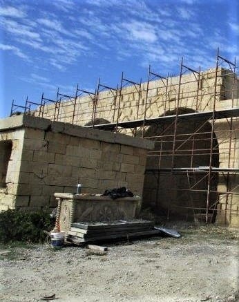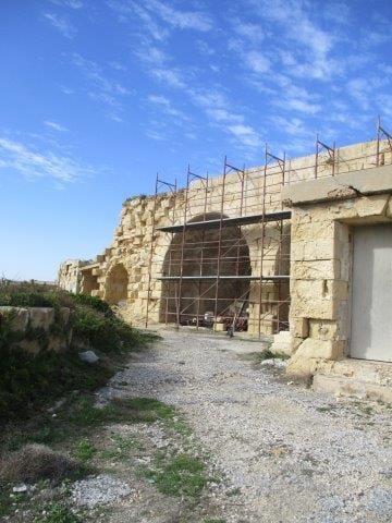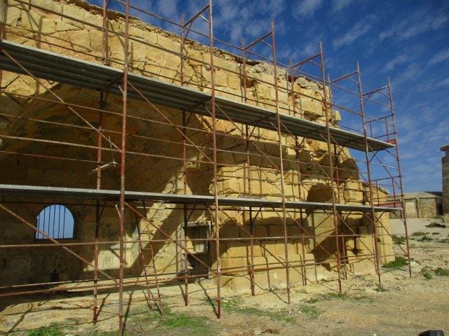 Assoċjazzjoni Wirt il-Kalkara notes with satisfaction that during the last months preliminary restoration works at Fort Ricasoli have initiated. The works being done consist mainly of the discharge of waste and other material through the Government Cleansing and Maintenance Division, and the erection of scaffolding and eventual restoration on the structure known as casemated battery by the Restoration Directorate.
