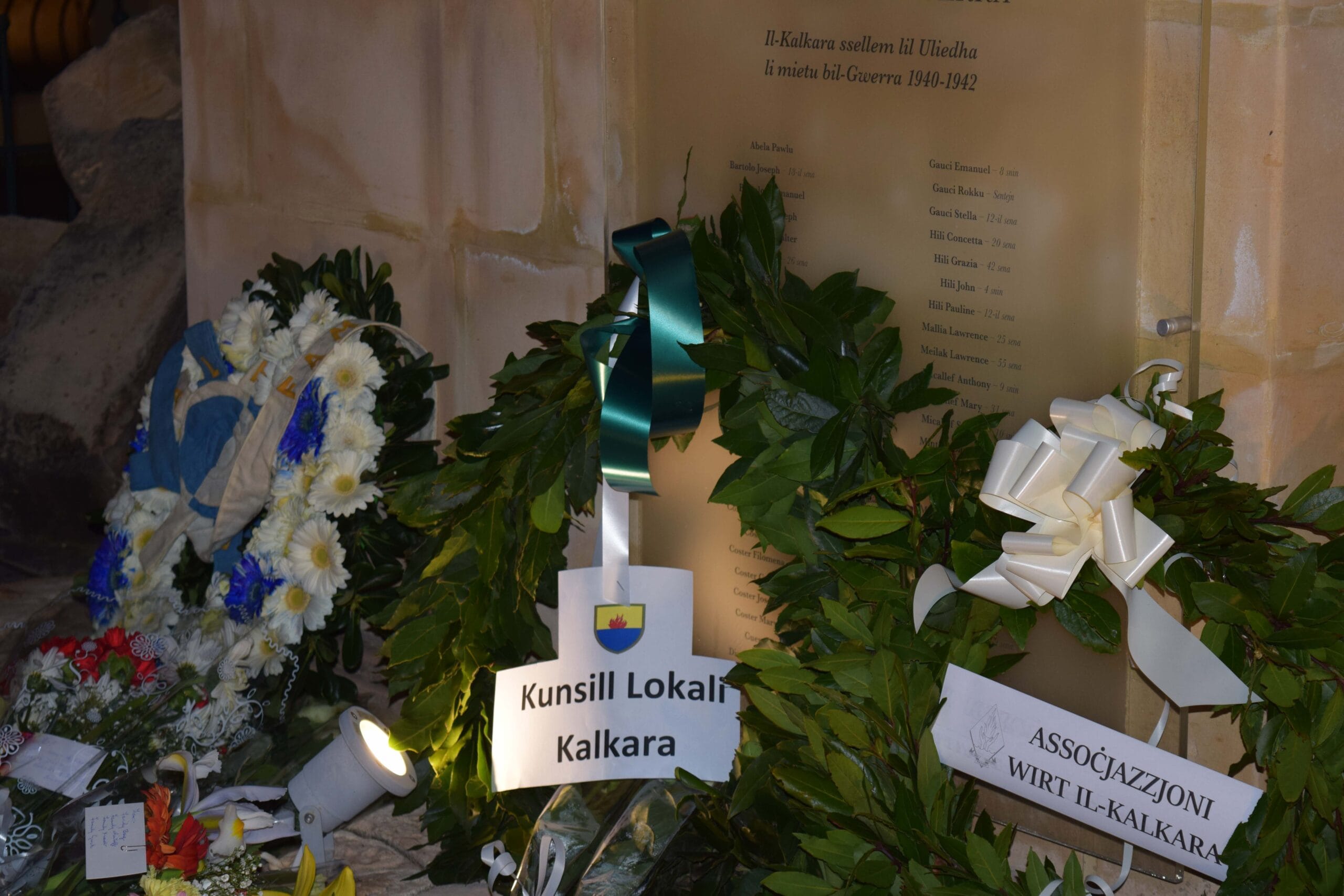Delegazzjoni mill-Assoċjazzjoni Wirt il-Kalkara illum ħadet sehem fil-Kommemorazzjoni tal-Vittmi Kalkariżi tat-Tieni Gwerra Dinjija, serata mtella’ mill-Kunsill Lokali tal-Kalkara. Propju bħal-lum, 24 ta’ Marzu fis-sena 1942 seħħet waħda mill-agħar traġedji fl-istorja riċenti tal-Kalkara, bil-mewt ta’ 23 ruħ f’xelter li kien jinstab Triq Patist Borda. Dan minbarra għadd kbir ta’ traġedji oħra li seħħew matul dak iż-żmien, fosthom nhar l-10 ta’ April 1942 meta ġġarfet għal kollox il-Knisja Parrokkjali. Għal dan il-għan, rappreżentanza mill-Kumitat tad-Direzzjoni tal-Assoċjazzjoni Wirt il-Kalkara attendiet għall-quddiesa fil-Knisja Parrokkjali, u wara l-President Ivan Cauchi, fil-preżenza tas-Sindku Speranza Chircop u l-Kunsilliera, qiegħed kuruna tar-rand f’ħoġor il-monument tal-gwerra li jinsab fi Pjazza Sagra Familja. Id-delegazzjoni tal-Assoċjazzjoni Wirt il-Kalkara kienet magħmula mill-President Ivan Cauchi, Segretarju Duncan Brincat, Viċi President Nathalie Seguna u l-Uffiċjal tal-Komunikazzjoni Etienne Camilleri.